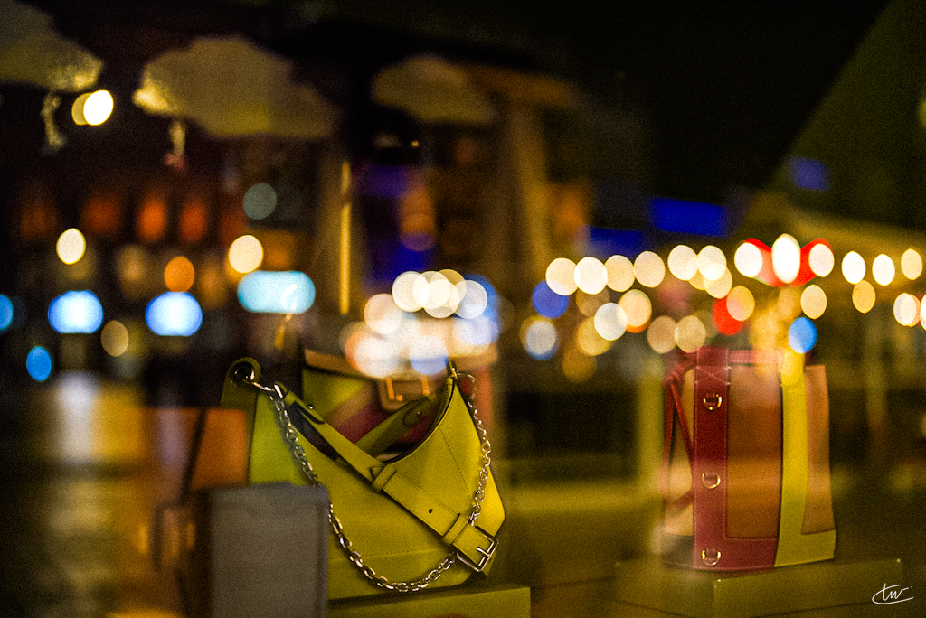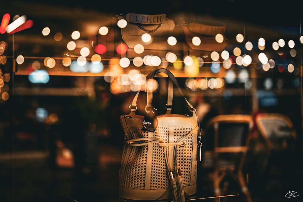 "Quand l'artisanat rencontre le bokeh urbain - le cuir Lancel capte la lumière comme la ville capte les rêves, précis au milieu du flou."